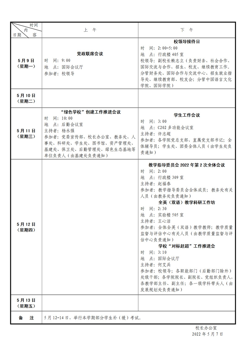 第11周会议和活动安排表