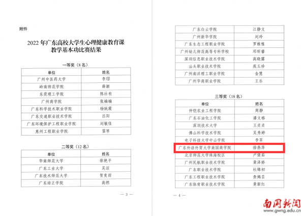 本网讯 近日,广东省教育厅公布了2022年度广东高校大学生心理健康教育课教学基本功比赛结果,我校团委书记徐燕萍老师凭借新颖的课程设计和过硬的教学基本功荣获三等奖。