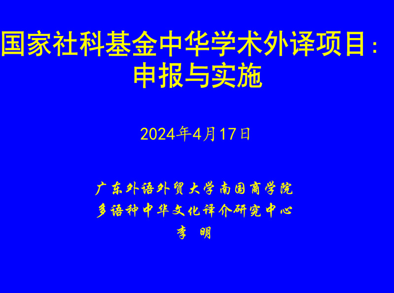 本网讯 4月17日下午,由科研处主办的2025年度国家社科基金中华学术外译项目申报首场辅导会“国家社科基金中华学术外译项目:申报与实施”在多语种教学大楼H402举行。译介研究领域专家、译介中心副主任李明教授应邀进行了专题辅导,来自我校各院部及科研机构拟申报项目的骨干教师及对中华学术外译感兴趣的近20名教师前来聆听了专题辅导。