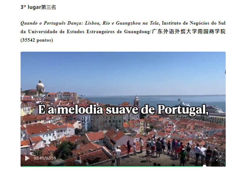 本次大赛是面向全国葡语学习者的重要赛事,具有一定专业性与国际影响力。获奖团队由西方语言文化学院葡萄牙语专业2022级本科生王晓轩、胡楚燕及2024级本科生李芊雨组成,她们创作的作品《葡语翩跹:里斯本、里约、广州三城一屏相连Quando o Português Dança: Lisboa, Rio e Guangzhou na Tela》以其独特的创意构思、精心的制作及对文化的有趣理解赢得了评委的认可和观众的喜爱,勇夺大赛第三名。