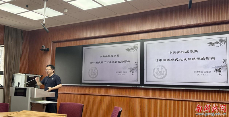 本网讯 6月12日下午,2025年第5期博士沙龙系列活动在G301会议室成功举办,博士沙龙活动主题为“中美关税战及其对中国式现代化发展路径的影响”,活动由学科建设办公室(博士工作站)、科研处、教师发展中心和经济学院主办,经济学院副院长王继洲博士作为主讲嘉宾。