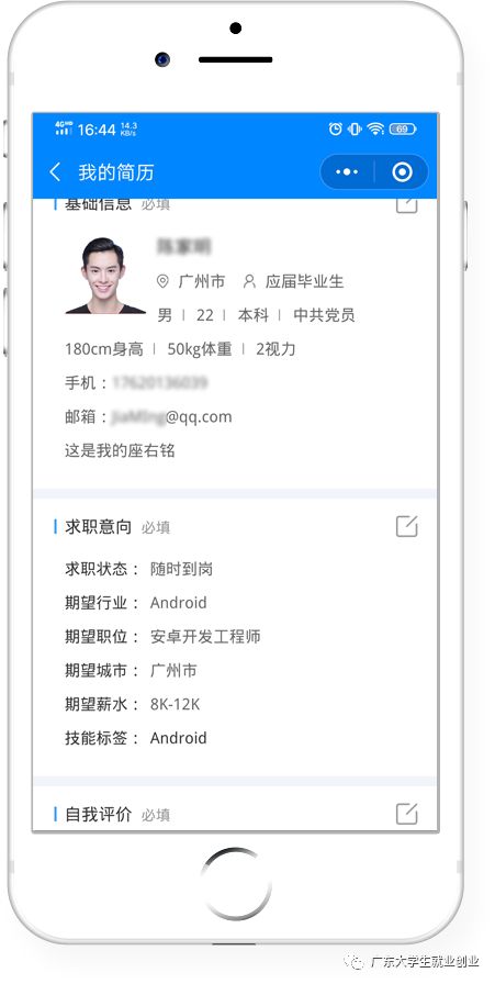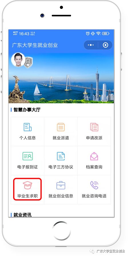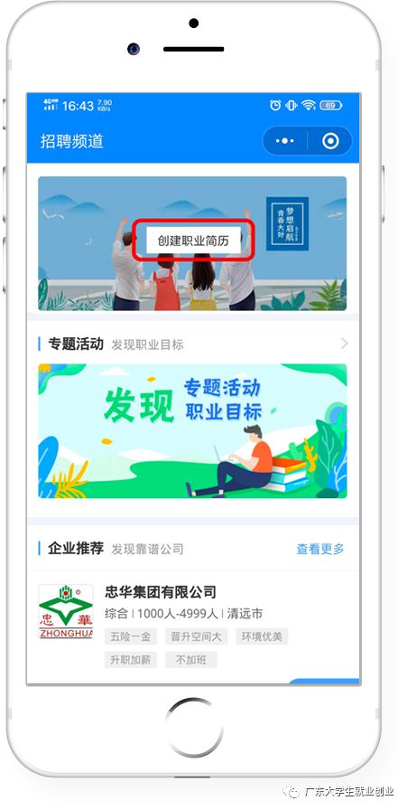 首先,关注微信公众号“广东大学生就业创业”,进入办事大厅后点击“毕业生求职”模块创建职业简历。