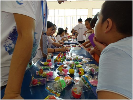 下午两点班主任组织小朋友进场,进行第一轮的才艺展示兑换积分,小朋友们凭自己在上课时候制作的手工品与摊位老师兑换积分,通过手工品或者小朋友们自己的才艺展示与老师兑换积分,从而锻炼小朋友的沟通能力。