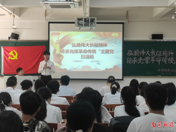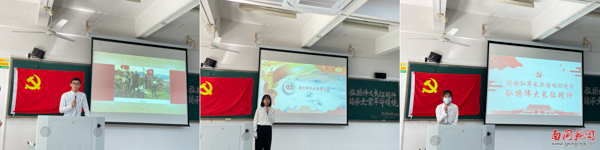 活动中,三位党员依次分享了老红军长征的故事。霍舒卉同志分享的是革命先辈成仿吾的故事。成仿吾是长征路上唯一的大学教授,他一心从事党的教育事业,五次翻译《共产党宣言》,为准确地宣传马克思主义做出重要贡献,他创作的革命作品,对推动我国革命的新文化运动起了重要作用。林春娃同志分享了战地女杰贺子珍的故事。贺子珍虽有身孕,却毅然决然地加入长征。在长征途中,她用自己虚弱的躯体掩护其他伤员,她舍身忘死的高贵品质激励着战士们战胜各种艰难险阻,走向最后的胜利。“先辈们抛头洒热血才换回今天的辉煌成就,我们应该以史为鉴,将其转化为动力,为祖国的建设添砖加瓦。”林春娃同志表示。郭雨杰同志分享的是革命烈士陈树湘的故事。他参加过秋收起义,在井冈山、中央苏区历次反“围剿”战斗中浴血奋战,在掩护红军主力和中共中央、中央军委机关抢渡湘江战役中立下汗马功劳。他以年轻的生命,实现了“为苏维埃新中国流尽最后一滴血”的誓言。