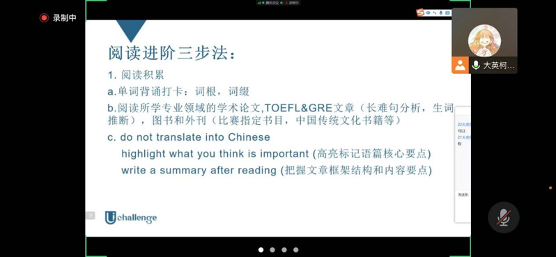 2022年10月14日晚,国才杯阅读比赛备赛讲座通过腾讯会议顺利举行。该活动由创新班阅读团团长柯伊蔓老师主讲,2020级、2021级以及2022级大学英语创新班和第二外语(英语)创新班的同学参与了本次活动。