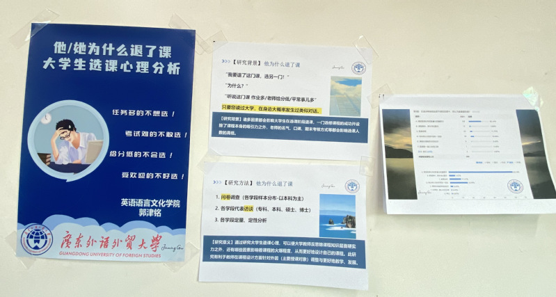活动现场,与会成员欣赏了广外研究生以海报形式展示的研究成果。这些研究成果涵盖了大学生活中的多个方面,包括大学时逃课/退课心理分析、高校小组作业中低积极性现象调研及设计建议(基于社会惰性理论)、教师热情与学生感知的任务价值、课堂无聊的关系等。每个海报都以清晰的图文结合的形式呈现,将学术内容生动易懂地展现在观众面前。这些研究课题不仅具有趣味性和创新性,还深入探讨了教育领域的实际问题,引发了与会者的广泛关注和深思。