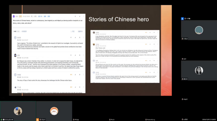 随后,彭澎老师介绍了将“理解当代中国”理念融入《跨文化商务礼仪》课程的情况与成果。她以Unit 2“Core Socialist Values”和Unit 3 “Boosting Cultural Confidence”两个单元的教学设计为例,展示了如何引导学生进行讨论和思考中国历史上的英雄们以及他们身上体现的中华美德与文化价值观。通过案例分析和任务设计,彭老师引导学生分组进行不同话题的课堂展示,如“Changes in China and the responsibilities of the young Chinese generation”、“the transformation and innovation of Chinese culture”、“Comparing cultural values in China and the UK”等丰富话题。最后,彭老师展示了学生课下完成的一些视频作品,这些作品无不透露出满满的“理解当代中国”元素和学生们高昂的民族自豪感。