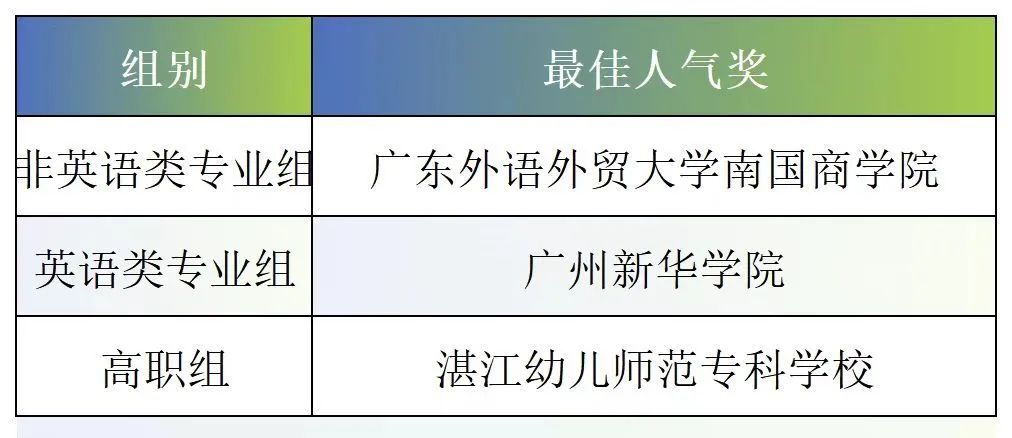 据悉,本次大赛由广东省本科高校外语类专业教学指导委员会和上海外语教育出版社联合主办,广东省本科高校大学英语课程教学指导委员会协办,广东理工学院承办。大赛吸引了超过五十支来自广东省内高校的队伍参与,竞争激烈,精彩纷呈。我校学生团队此次获奖,不仅体现了我校学生扎实的语言基础和创作能力,也彰显了我校在大学英语教育和跨文化交流方面的教学成果,又一次在省级竞赛的舞台上展现了南国风采。(大英部张芬)