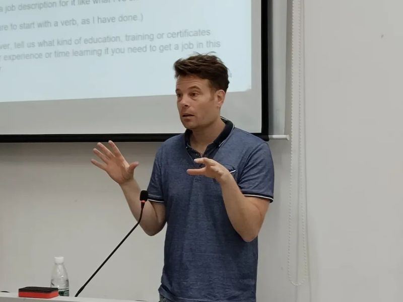 活动伊始,Ryan老师便直奔主题,点明把握未来职业发展趋势对于大学生的重要性。他基于当今社会AI产业兴起,人工智能蓬勃发展、环境保护需求不断提升、老龄化加剧等变化与特点,介绍了如环境工程师、教育工作者、科技工程师等职业在未来五到十年的发展趋势,引导同学们加深对自身职业发展规划的思考。