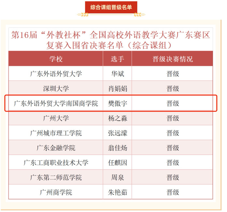 在6月7日举行的第16届“外教社杯”全国高校外语教学大赛(大学英语组)广东赛区省决赛中,我校大学英语教学部两位教师表现出色成绩亮眼:曹舒青老师荣获视听说组一等奖、樊傲宇老师荣获综合课程组二等奖;此外,曹舒青老师还凭借其出色表现斩获优秀青年教师奖。