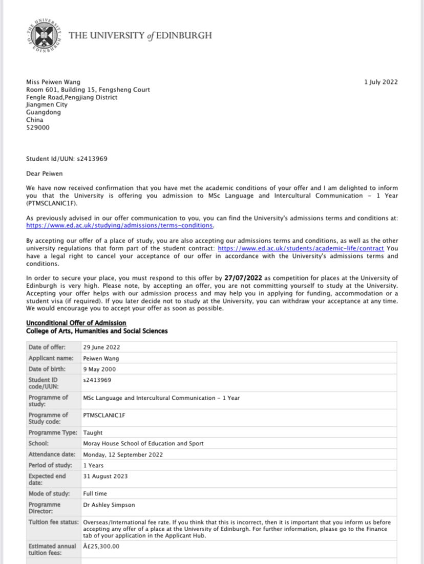 王沛文 英国爱丁堡大学 语言与跨文化交际专业