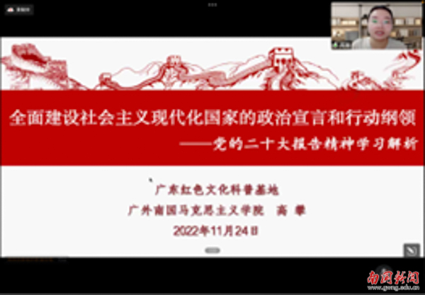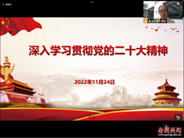 本网讯 近日,经济学院党总支与英语语言文化学院党总支以线上方式联合开展党的二十大精神宣讲会。邀请学校党的二十大精神“理论宣讲团”团长、马克思主义学院副院长高攀副教授担任主讲人。两院师生党员、学生干部代表等近300人参加学习。英文学院党总支书记赖敏主持会议。