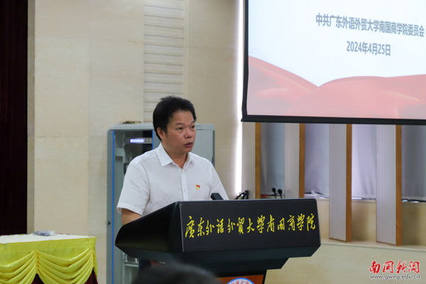 本网讯 根据中央、省委关于切实抓好《中国共产党纪律处分条例》学习贯彻的要求,按照《中共广东外语外贸大学南国商学院委员会2024年党员教育培训工作方案》的工作部署,4月26日下午,学校在C201报告厅召开党纪学习教育读书班专题辅导暨党委理论学习中心组(扩大)会议,特邀广东外语外贸大学纪委副书记苏奕就新修订的《中国共产党纪律处分条例》(以下简称《条例》)做专题辅导。学校党委委员,各党总支书记,直属党支部书记,党支部书记,各职能部门、学院(教学部)副处级以上党员领导干部,师生党员代表,党委组织部有关人员近260人参加党纪学习教育专题培训。