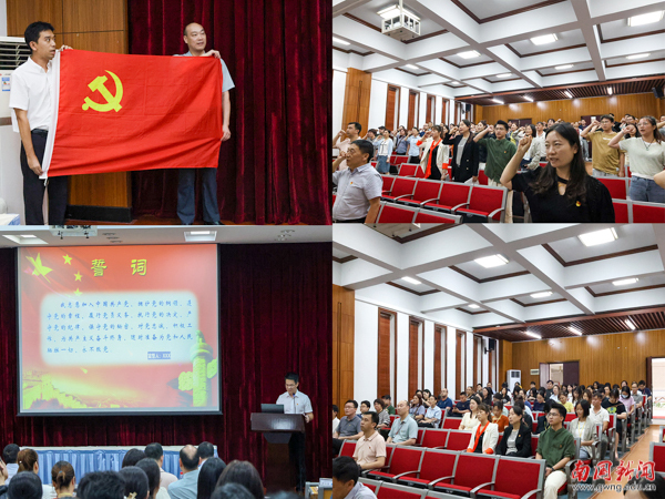 “我志愿加入中国共产党,拥护党的纲领,遵守党的章程……”党课结束后,在机关党总支书记舒江津的带领下,全体与会党员佩戴党徽,面对党旗,举起右拳,庄严宣誓。每一位党员字字铿锵,心潮澎湃,回顾了自己在入党宣誓时的庄严承诺和坚定信念,心灵再一次受到洗礼,思想又一次得到升华。