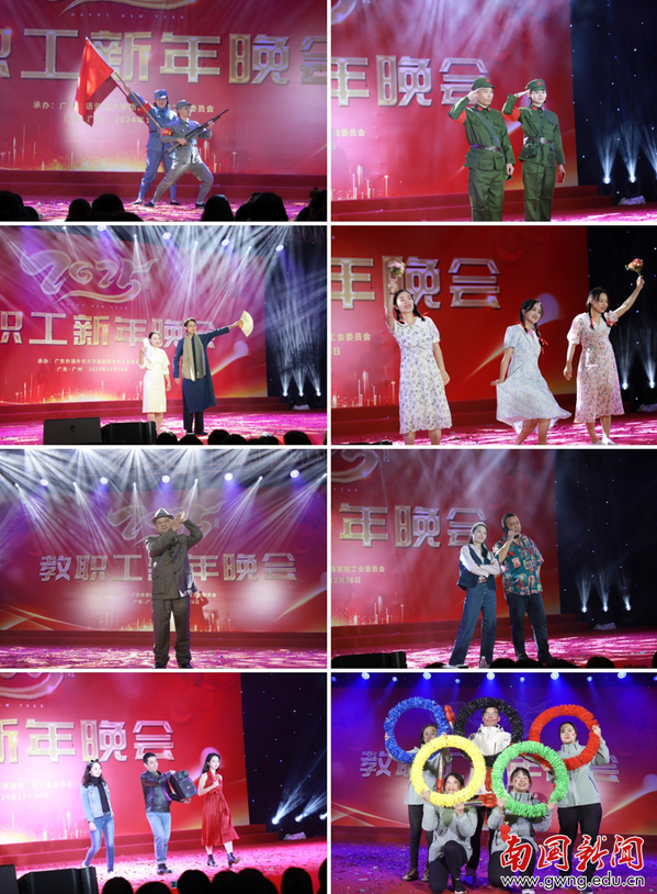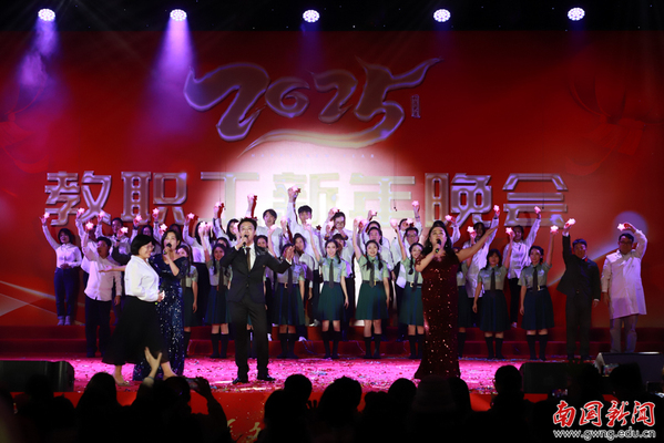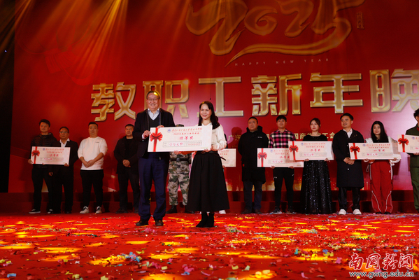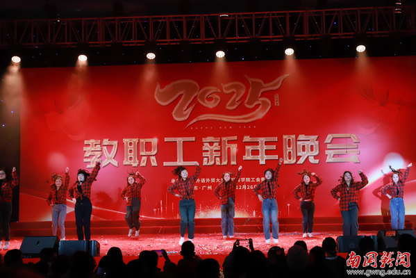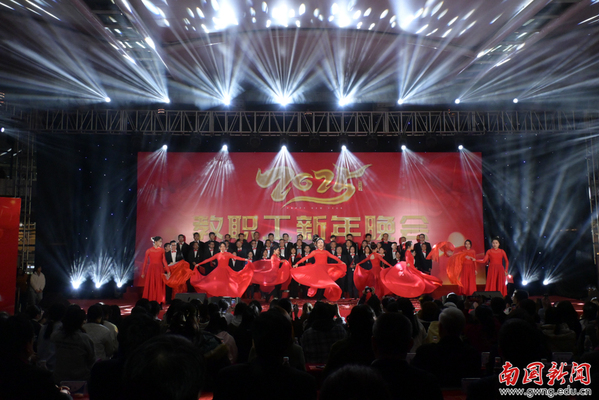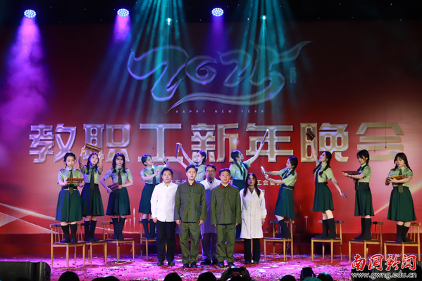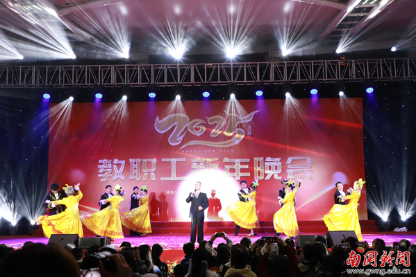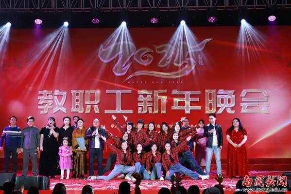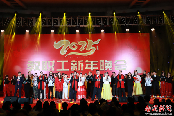 本网讯 华灯璀璨映星空,迎新晚会乐融融。12月26日晚,我校教职工迎新晚会在学校文化广场隆重举行。晚会成为大家才艺大比拼的舞台,热歌劲舞、武拳走秀、情景剧轮番上演,更有大量金曲被爆改,南国地标建筑、发展历程、教育理念以及对南国的美好希冀皆被巧妙地融入了熟悉的旋律之中,赞颂之声不绝于耳。四位校领导更是携手朗诵原创诗歌《万疆》,深情诵赞祖国。整场晚会充分展现了我校教职工的才艺与风采,为即将到来的新年增添了浓厚的喜庆氛围。