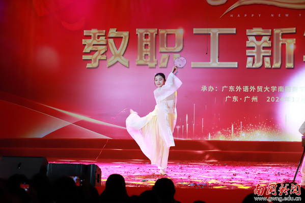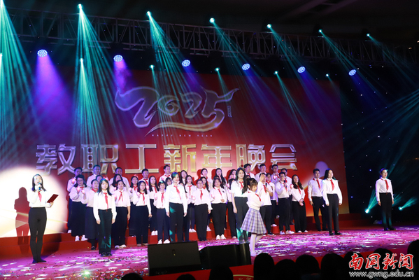在悠扬乐声的伴奏下,大学英语教学部工会的老师们以情带声,他们巧妙地将南国比作那璀璨夺目的太阳,字里行间满是对学校的深切祝福与美好期许。随后,他们以热情洋溢的舞蹈和欢快嘹亮的歌声,将教职工的活力与魅力展现得淋漓尽致。