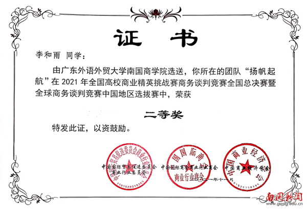 该竞赛是由中国国际贸易促进委员会商业行业委员会、中国国际商会商业行业商会与中国商业经济学会主办,面向在校大学生的综合性商科类专业竞赛。本次竞赛经过校内知识赛和全国地区选拔赛选拔,最终有来自全国60多所高等院校171支参赛团队,近1200位辅导教师和参赛选手进入全国总决赛。晋级全国总决赛的团队通过直播抽签分组确定商务谈判的持方,并在组委会指定平台进行线上视频谈判,最终评委根据线上视频谈判进行打分和评选。我校共有36人通过校内知识赛,经过层层选拔,最终“扬帆起航”队进入全国总决赛,并取得了二等奖的好成绩。