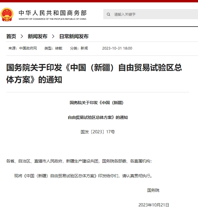 建立中国(新疆)自由贸易试验区(以下简称自贸试验区)是党中央、国务院作出的重大决策,是新时代推进改革开放的重要战略举措。为高标准高质量建设自贸试验区,制定本方案。