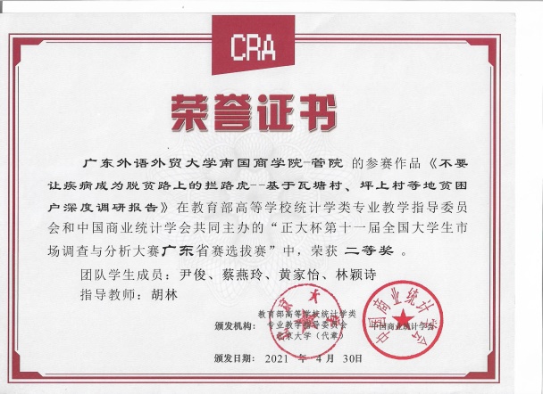 近日,“正大杯”第十一届全国大学生市场调查与分析大赛广东赛区选拔赛落下帷幕。我院胡林老师指导的两支学生队伍参赛,分别取得广东省赛二等奖、全国总决赛三等奖的喜人成绩。