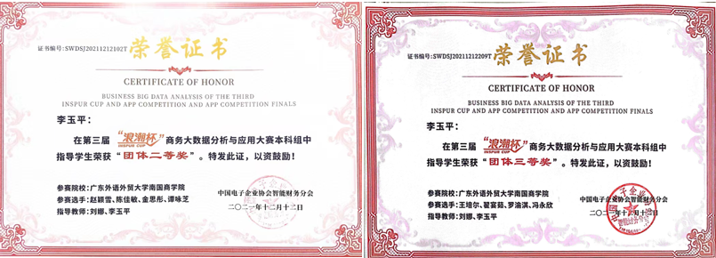 本网讯 20211212日,全国200支本科队伍参加了由中国电子企业协会主办,东北财经大学承办,山东浪潮铸远教育科技有限公司提供技术支持的第三届“浪潮杯”商务大数据分析与应用大赛全国总决赛。本次大赛采用云上比赛方式,经过激烈角逐,我校参赛的2支队伍分别取得了团体二等奖和团体三等奖的佳绩