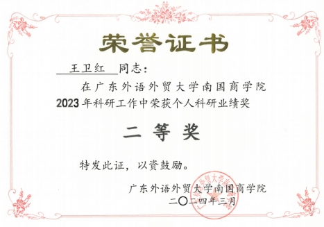 王卫红教授在2023年的科研工作中表现突出,成功撰写咨政报告获厅局级以上领导批示或内参刊登7篇,其中省部级1篇、副省级1篇、厅局级4篇、《南方智库报》刊登1篇,荣获个人科研业绩奖二等奖。