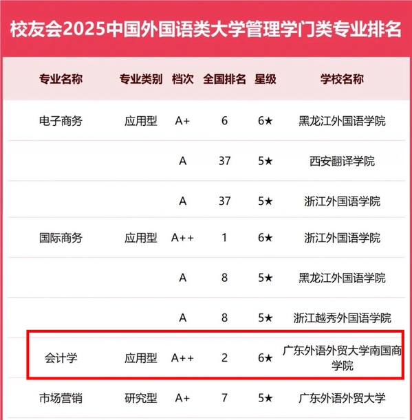 近日,全国第三方权威教育评价机构艾瑞深校友会网发布《2025中国外国语类大学一流专业排名》。广东外语外贸大学南国商学院凭借扎实的专业建设与人才培养成果,在应用型高校评选中表现亮眼,位居2025中国外国语类大学一流专业排名(应用型)第六。在2025中国外国语类大学一流专业排名(应用型)中,管理学院会计学专业获评六星级(6★),位居管理学门类专业全国第二;旅游管理专业以五星级(5★)实力跻身管理学门类专业全国第41位,凸显学科综合优势。