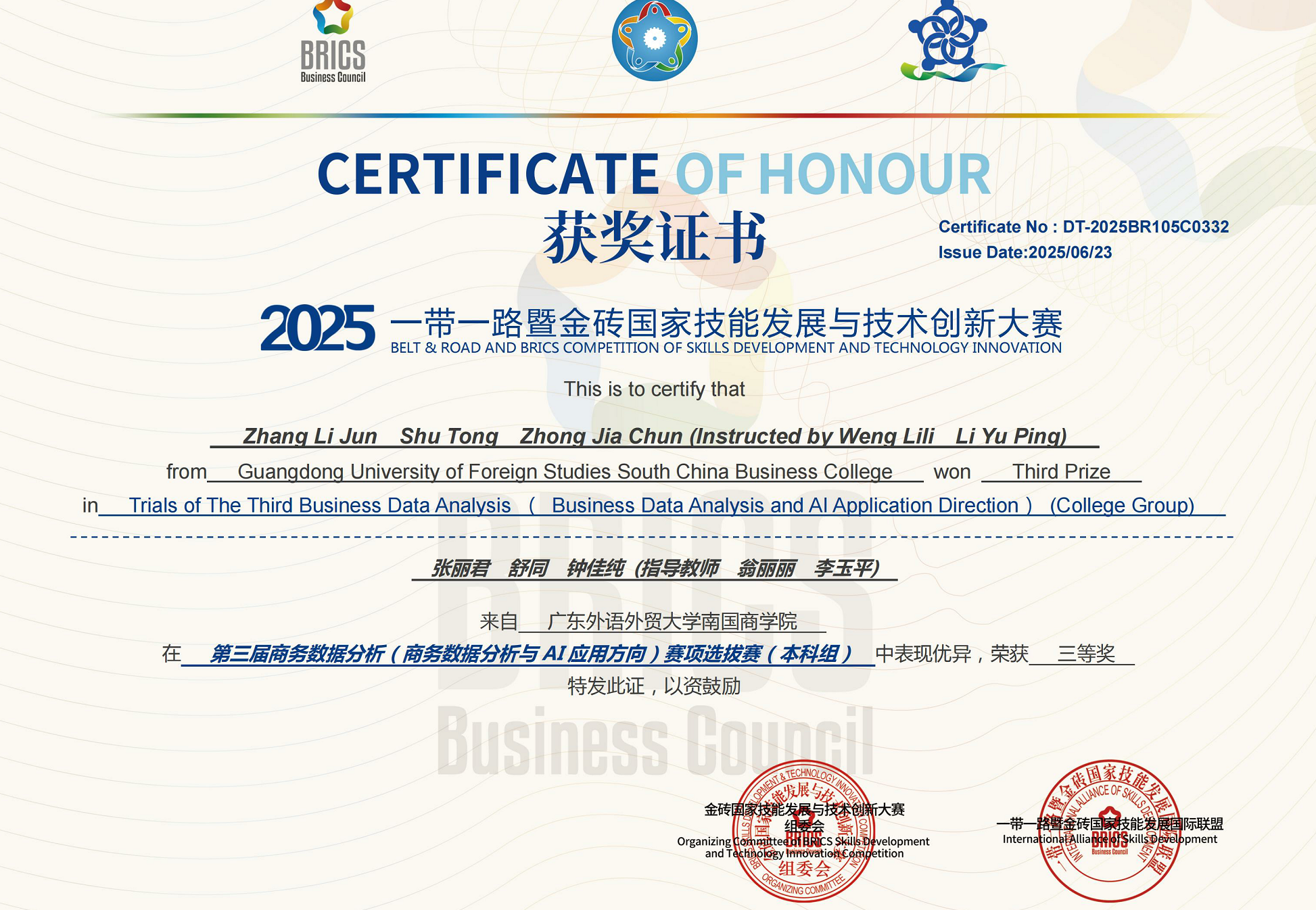 近日,2025“一带一路”暨金砖国家技能发展与技术创新大赛——第三届商务数据分析赛项(商务数据分析与AI应用方向)全国选拔赛中,我院派出的三支参赛队伍全员获奖,均荣获三等奖,实现了优异的集体成绩。