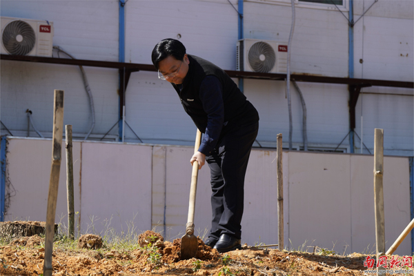 本网讯 3月12日下午,为深入贯彻习近平生态文明思想,加强学生生态文明教育,推动绿美广东生态建设,校团委青年志愿者行动指导中心在学校保卫处附近空地举办“绿美广东,青年先行”共植绿美青年林植树节活动。党委书记许志超、副校长赖志立与各学院师生代表40余人参加活动,共同在校园栽种10余棵树苗。