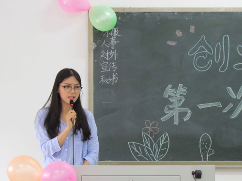 而后,指导老师黄泳茵上台发言,她对学会的职能及未来一年的工作计划进行了简单的讲述,并详细介绍了五周年和头脑风暴等活动,最后还对创学提出了个人期许:希望干事们积极参与活动,从中发挥出个人的独特优势。