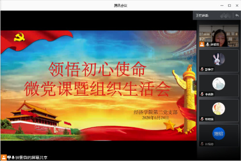 本网讯 经济学院第二党支部于2020年6月24日晚上8:00在“腾讯会议”平台举行了“领悟初心使命――微党课暨组织生活会”活动。经济学院第二党支部书记吴连愉同志,教师党员陈欣建同志及经济学院第二党支部学生党员出席了本次会议。