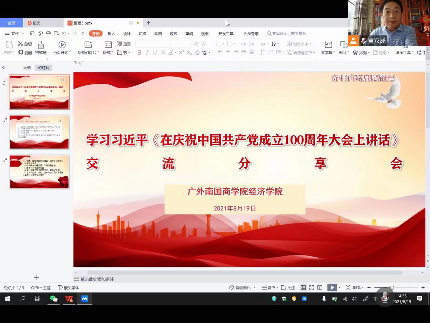本网讯 为深入学习贯彻习近平总书记在庆祝中国共产党成立100周年大会上重要讲话精神,坚持以习近平新时代中国特色社会主义思想为指导,牢固树立“四个意识”,坚定“四个自信”,做到“两个维护”,引导党员同志“学党史、强信念、跟党走”,经济学院党政领导班子在2021年8月19日下午3时召开学习习近平总书记庆祝中国共产党成立100周年大会讲话精神的线上会议。会议由党总支书记黄汉成同志主持,学院院长蒋满元、院长助理党雪、李玥,团委书记李惠良、各党支部书记以及副书记等参会并结合自身工作和思想感悟先后进行发言。