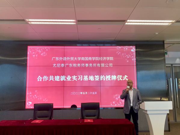 尤尼泰董事长梁东建对公司的发展及业务做了介绍,作为中国首家被授予5A级的税务师事务所,在公司专业人才队伍建设中,希望后浪推前浪,能有更多年轻优秀的人才加入。在过往与签署校企就业实习协议院校的合作中,尤尼泰已取得不错的成果,充分证明了校企合作共建就业实习基地这种模式对企业人才队伍建设的帮助,通过校企双方的共同努力,在协议的框架内,优势互补,充分展开各种合作,一定能够把合作推向新的高度,达到双方互利共赢。