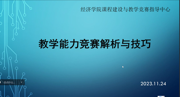 本网讯 11月24日上午,为深入推动我院教育教学改革,充分发挥优秀教师的示范引领作用,“以赛促教”,引导教师潜心教书育人,推动教学创新,经济学院副院长高洁为青年教师们传授教学能力竞赛经验,梁少毅、姚晓垠、肖桂姣、黄跃、尹秀珍老师参加此次培训。