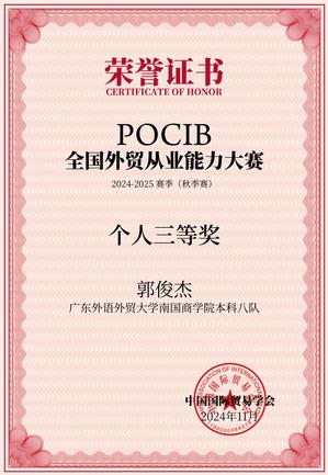 本网讯 由中国国际贸易学会主办的第十四届POCIB全国外贸从业能力大赛(秋季赛)于11月19日圆满落幕。经济学院副院长高洁带领3支团队(32人)与全国各大高校同台竞技,最终斩获全国团体三等奖3项、1人荣获全国个人二等奖、2人荣获全国个人三等奖。高洁老师被评为优秀指导教师三等奖。