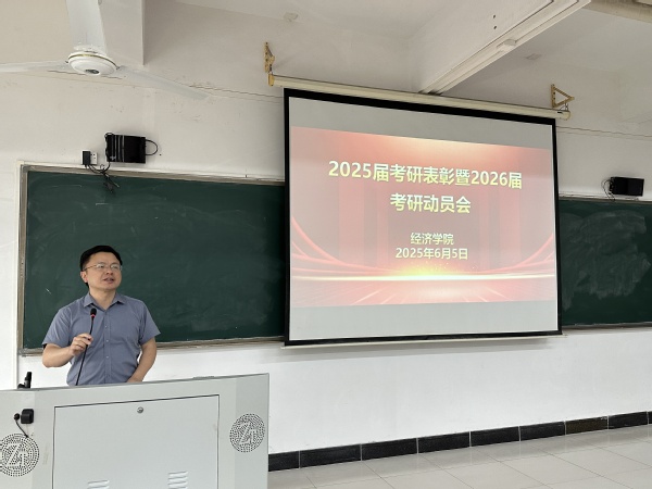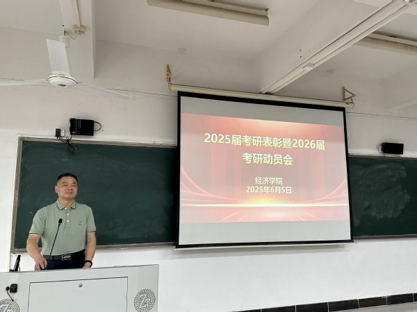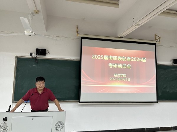 本网讯 2025年6月5日下午,经济学院召开2025届毕业生考研表彰暨2026届毕业生考研动员会,旨在表彰优秀考研学子,激励更多同学积极投身考研征程,为未来的学术和职业发展奠定坚实基础。院长苏武俊,党总支书记卢少勇,副院长王继洲、李玥,全体辅导员参加本次会议。广东财经大学招生考试处副处长吴玉强、我校教学质量监督与评估中心主任李焕荣受邀作专题辅导。会议由副院长王继洲主持。