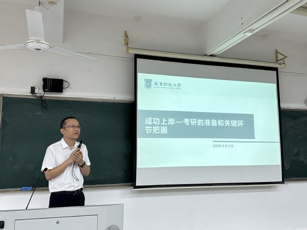 广东财经大学招生考试处副处长吴玉强为学生们带来了一场干货满满的专题辅导讲座。他从2025年考研情况介绍和2026年考研趋势预测、考研准备工作和关键环节把握、成功上岸的策略建议三个方面展开讲解。吴玉强利用直观的数据向学生传达了一个重要信息:2025年全国硕士研究生考试报名人数较去年减少50万,这也是近10年来考研报名人数连续两年下降,同时各高校纷纷扩招。这一消息如同一针强心剂,极大地鼓舞了同学们的信心。他还详细梳理了考研时间线,着重强调选择合适的学校和专业是成功上岸的首要条件,为同学们的备考指明了方向。
