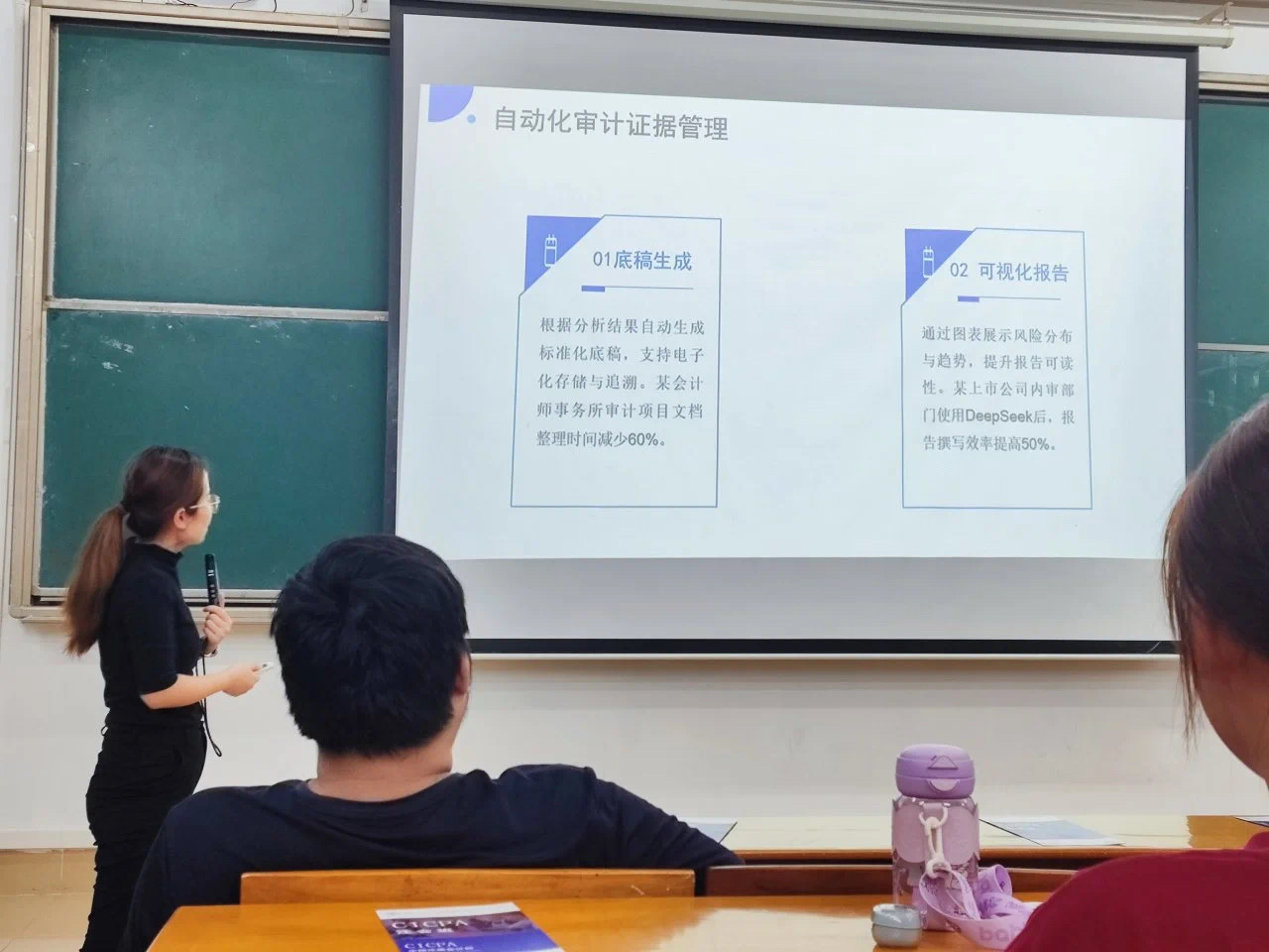 AI智能时代来临,会计行业正在经历前所未有的变革,为让同学更好了解和把握会计行业发展动向,广外南国继续教育部于2025年3月27日下午在C402开展“AI赋能职业发展——解锁财务精英成长之路”专题讲座,讲座由中国注册会计师(CPA)、美国管理注册会计师(CIMA)及ACA特许公认会计师,曾任职全球四大会计师事务所的Lisa Liu老师主讲。 1、讲座伊始 讲座中,Lisa老师系统探讨人工智能对财务领域的深刻影响及从业者的未来发展方向。老师曾任职全球四大会计师事务所及美资会计事务所Marcum BP(美国前十),凭借丰富的行业经验与前沿洞察,为同学们呈现了一场兼具理论与实践价值的精彩讲座。 Lisa老师从AI核心技术、行业趋势与职业发展三方面展开深度剖析。老师指出人工智能重构财务职能,从AI核心技术出发,洞悉未来会计发展。Lisa老师提出我们能够利用AI技术通过简化指令快速生成财务报表(如资产负债表、利润表等),降低操作门槛,提升效率。刘老师以美团收购摩拜为例,强调数据价值在于“识别趋势、预测未来”,推动管理会计从“记录过去”转向“规划未来”。AI时代我们可以用AI的自动化替代基础工作,如发询证函(审计中验证企业银行存款的核心流程)、税务申报等重复性任务,机器人可实现7×24小时高效处理。 课堂互动照片