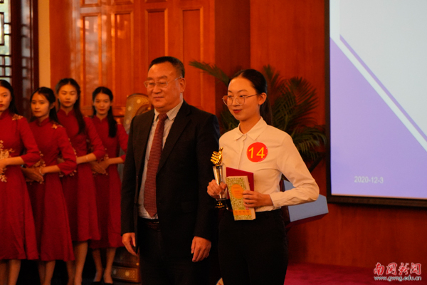 本网讯 12月3日下午,由“强化外语语言训练,提升外语运用能力”领导小组与教务处主办,大学英语教学部承办的首届南国“英语经典”朗诵大赛(大英组)在国际会议厅举行。来自各学院的20名非英语专业学生经过班级初选、视频复赛的选拔,进入决赛。大赛评委由大学英语教学部的教师组成,董事长丁小军,执行校长王华,督学顾也力,副校长王心洁、赵晨出席决赛现场,与师生一同观摩了本次大赛。