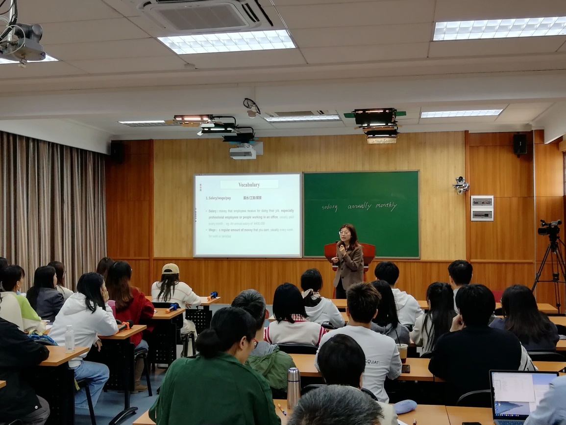 在第一部分,袁珊珊老师重点讲解本节课教学涉及到的关键术语,帮助学生初步建立以英文表述的涉及讨论薪酬管理问题的专业术语体系(Professional discourse system),为后续学习打基础,做铺垫。在第二部分中,袁珊珊老师结合对总薪酬概念的解释,帮助学生用英文理解总薪酬的构成部分及其相互关系。在第三部分,袁珊珊老师针对教学内容提出问题,与学生展开了与薪酬管理的相关的讨论。最后,袁珊珊通过展示与教学内容密切相关的音频、视频材料,对学生进行了听力训练。