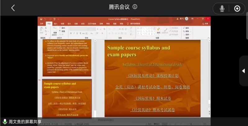9月22日晚,本学期全英(双语)教学教师培训第二讲采取线上形式“腾讯会议”进行,由全英(双语)教学专家组组长周文贵教授主讲,7位新报名教师参加培训。此次培训主题有两个,一是如何撰写课程教学大纲,二是全英(双语)课程考试命题、制卷、阅卷规则。周文贵教授还向新参训的教师提供了全英文撰写的课程教学大纲和全英(双语)课程试卷的范本。