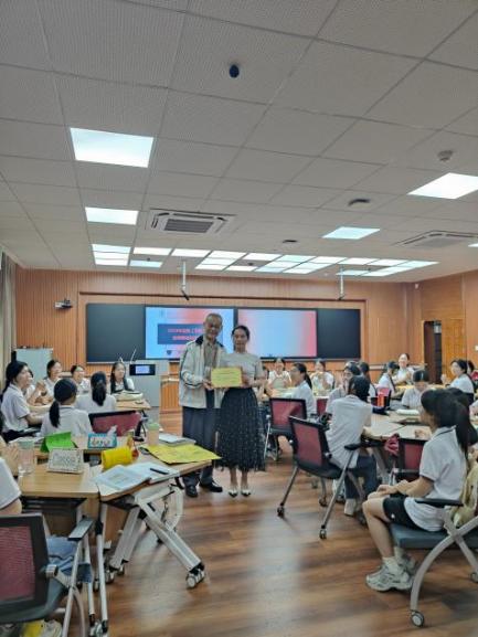 2023年全英(双语)教学资格证授予仪式上,周文贵教授为张研、王可昕、李梦洁、王质悦、杨晓、周丹纯、邢雷、王思瑶八位新晋的全英(双语)教师颁发全英(双语)教学教师资格证,听课教师、2023级小学教育专业1班的学生见证了证书的授予仪式并对新晋双语教师表示热烈祝贺。