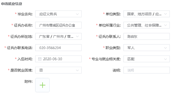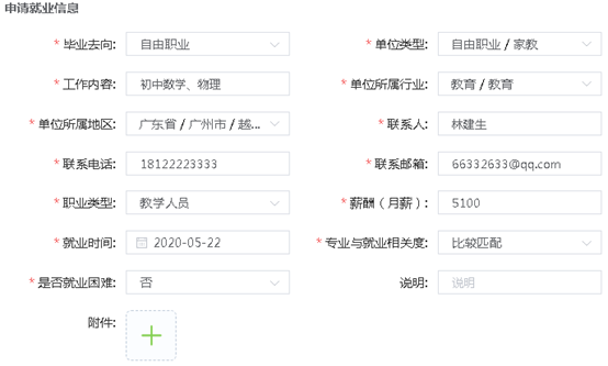 (3)其他录用形式就业。没有签订就业协议书或劳动合同形式的就业,选择它时“附件”可以上传有效的就业证明资料、例如:就业证明。