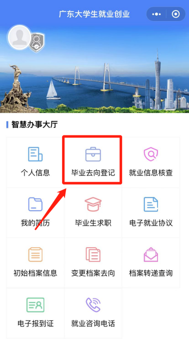 1.登录“广东大学生就业创业”微信小程序,点击“毕业去向登记”模块;