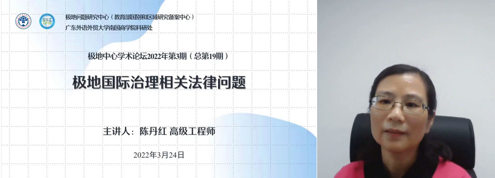 3月24日下午,极地中心学术论坛2022年第3期(总第19期)通过“腾讯会议”网络平台开讲,自然资源部国际合作司高级工程师陈丹红担任主讲人,畅谈 “极地国际治理相关法律问题”。我校督学顾也力出席论坛并致辞,论坛由极地问题研究中心主任刘兰凤主持。