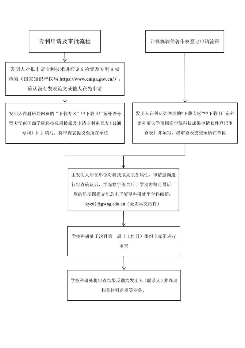 第一步:发明人在科研处网页的“下载专区”中下载《广东外语外贸大学南国商学院科技成果申请软件登记审查表》并填写,将审查表提交至所在单位;