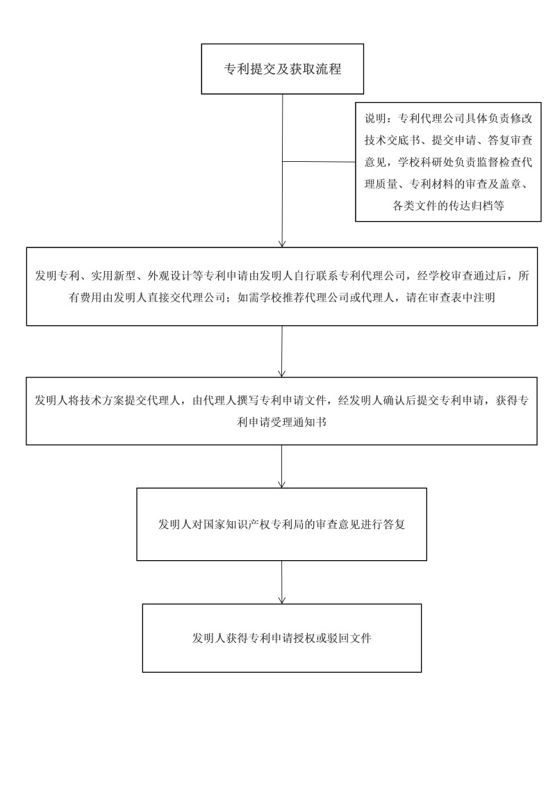 说明:专利代理公司具体负责修改技术交底书、提交申请、答复审查意见,学校科研处负责监督检查代理质量、专利材料的审查及盖章、各类文件的传达归档等。