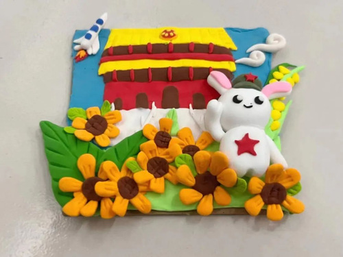 作品简介:作品以蓝天、白云、草地为大背景,主体为天安门,其前方有一片向日葵花田,象征着祖国的繁荣昌盛,花田中站着一只正在敬礼的小兔子,背后有一株麦穗,天空中有一支象征着祖国科技快速发展的火箭,表达了爱国爱党的信念。
