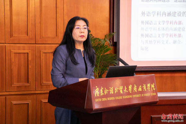 广东外语外贸大学副校长刘建达教授立足于新时代外语人才的培养,畅谈了他的学术观点以及对学校外语教育发展的建议。刘建达认为,要聚焦关键领域的涉外人才培养,解决国家外语人才卡脖子、卡脑子、卡嗓子的问题,发展中国式新文科。其次,培养复合型外语人才,凸显外语在教育教学的作用。最后,坚持目标导向推进涉外人才分类培养,尤其是对关键领域涉外人才强化外语能力培养。南国商学院外语教育发展应钻研“一精多会、一专多能”的国际化人才培养。