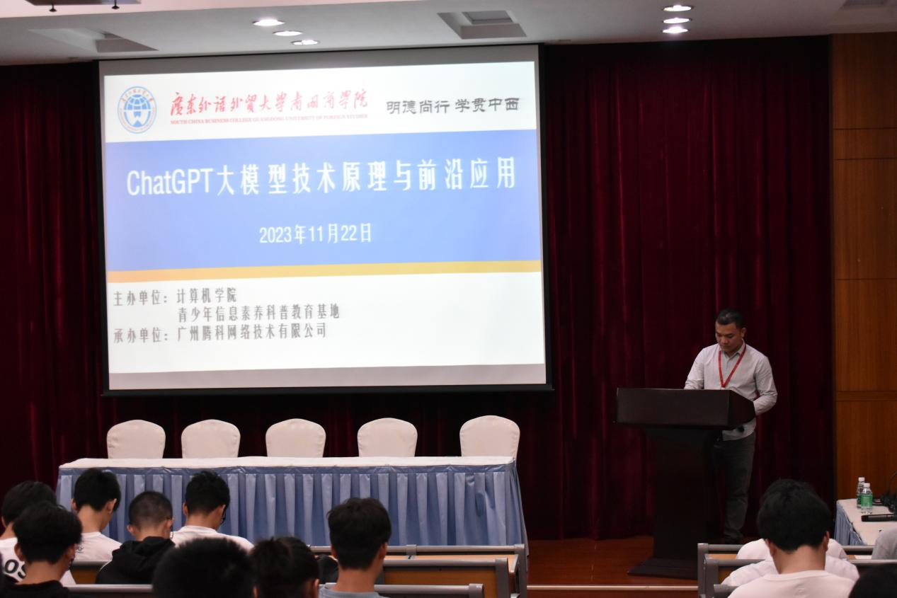 11月22日下午,青少年信息素养科普教育基地在F101召开了以“ChatGPT大模型技术原理与前沿应用”主题的学术讲座,粤港澳大湾区精准医学研究院多模态知识图谱算法工程师冯雷讲师受邀担任此次讲座主讲人,计算机学院副院长胡毅副教授以及计算机学院师生代表参加讲座,广州腾科网络技术有限公司宁明源经理主持讲座。