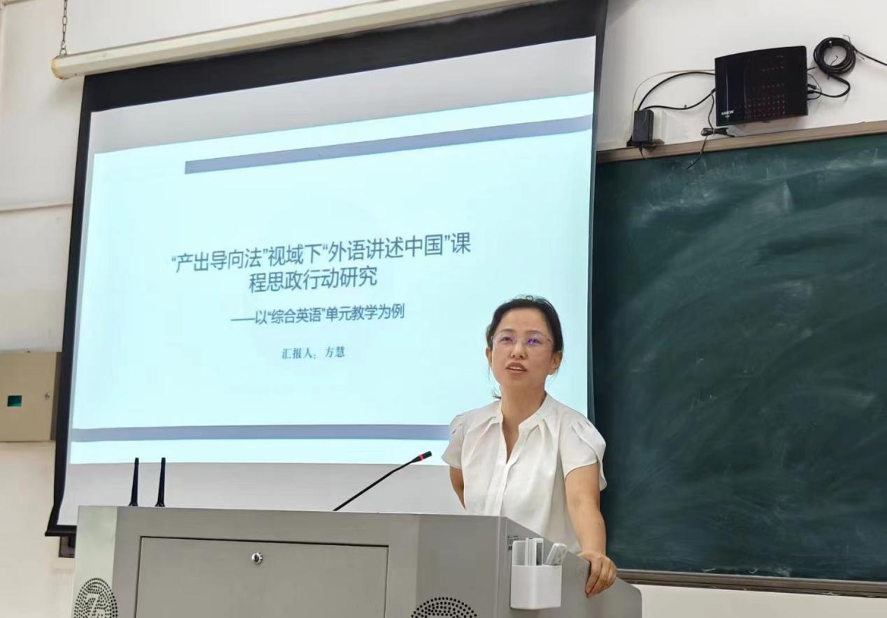接着,方慧副教授做了题为“‘产出导向法’视域下英语专业教学融合‘外语讲述中国’能力的行动研究——以‘综合英语’单元教学为例”的汇报。方慧介绍了研究问题---如何在英语专业教学中融合“外语讲述中国”的能力培养,详细讲解了她如何借助产出导向法(POA)、支架理论及最近发展区理论,融入教学思政目标,教学生用英语讲述中国当代平民英雄的故事,并重点汇报了第一行动研究的观察与反思和第二轮调整后的方案设计。随后,专家及老师们就方慧的汇报进行了深入的讨论。杨满珍教授对教学方案设计提出了建设性的意见,并提醒需重点关注如何提升学生的人文意识;王新强教授建议思政目标不易过细、POA目标不宜过大;李春梅副院长指出第二轮方案的改进应基于第一轮的教学观察与反思,并帮助方教授梳理思路。巢佳玉老师和莫敏英老师也分别提出了自己的见解。